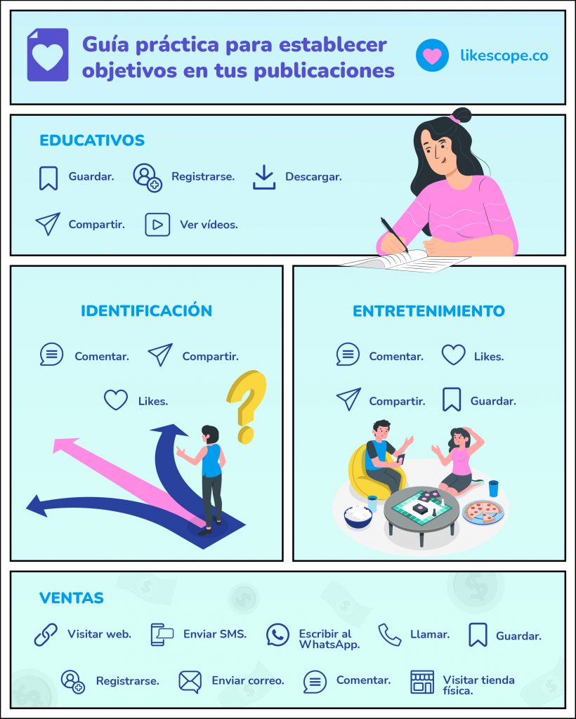 Este objetivo será tu indicador y te dirá si lo estás logrando y definirá tu CTA o llamado a la acción. Dependiendo del contenido que realices tendrá una acción específica, por ejemplo: